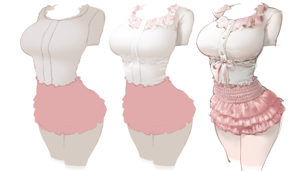 この製品はロリータスタイルの衣装素材のデモンストレーションです!ケーキスカートやマカロンカラーの服を描きたい方は、記録を参考にして試してみてくださいね ^^