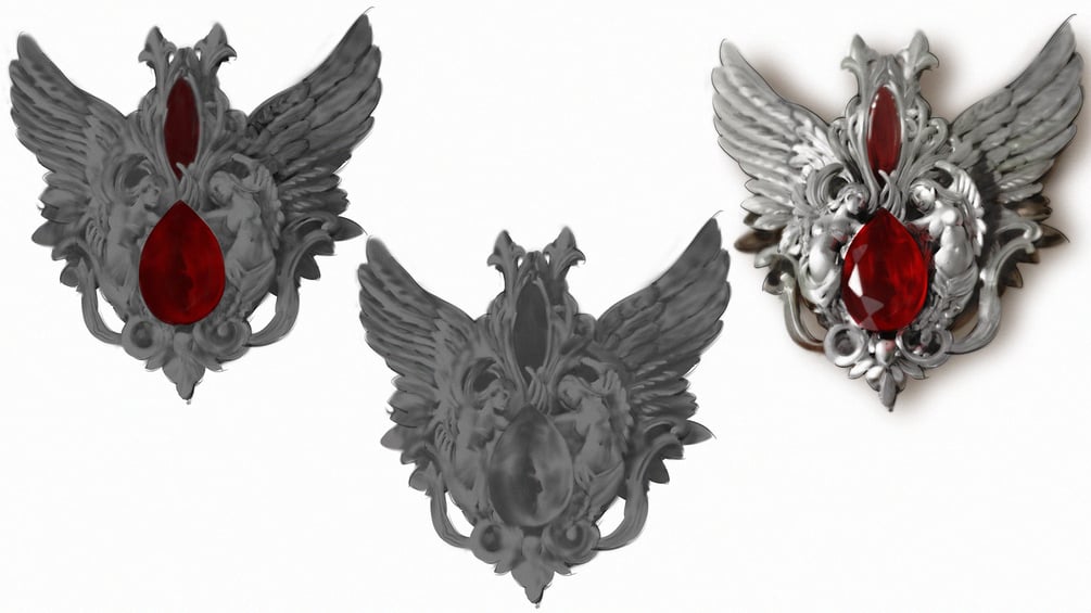華やかな装飾品を描く際、「透明感が出ない」「レイヤー構造が不明確」「立体感が足りない」といった悩みが多く見られます。今回のチュートリアルでは、まず造形構造から着手し、明確なシルエットとボリュームを構築します。次に、**アンビエント・オクルージョン(閉塞影)を用いてパーツ間の境界を際立たせ、宝石の透光感や金属の反射特性を丁寧に描き込みます。最後に光の減衰(Light fall-off)**を加えることで、空間的な奥行きと重量感を表現します。