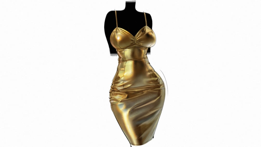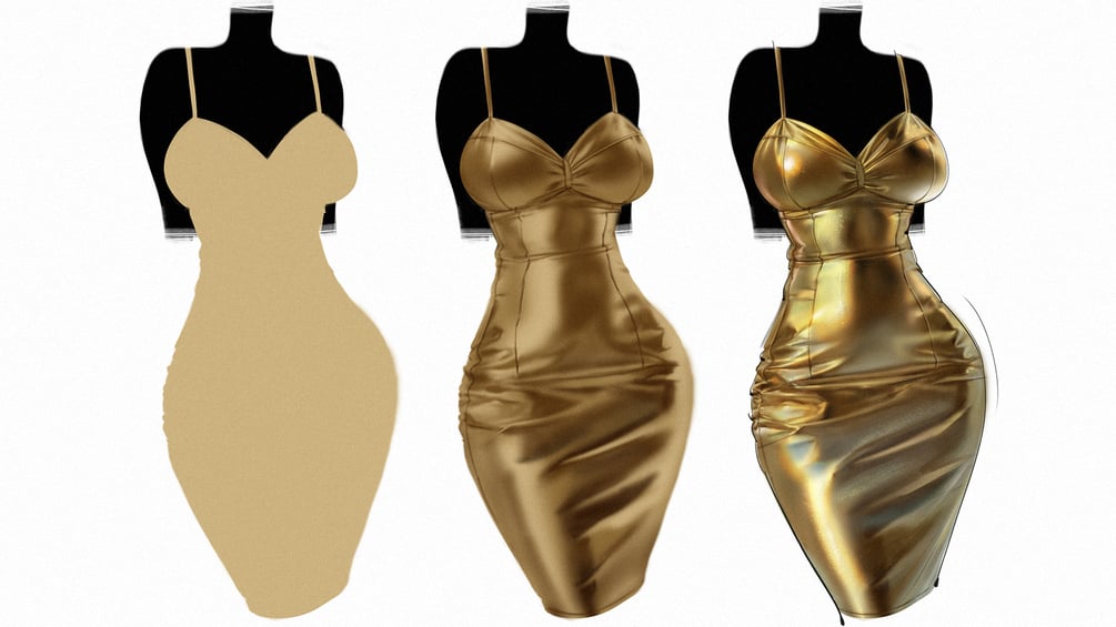 這次要示範的是一件 金色小洋裝!貼身的剪裁展現出身體曲線,搭配高反光的金屬質感,在光影下呈現出耀眼的反射效果。示範中我會拆解光影二分的處理方式,清楚展示布料在緊貼與拉伸時的褶皺變化,並透過強化結構讓整體更加立體真實。如果你也想挑戰金屬布料的表現,那這篇教學絕對不能錯過囉~!