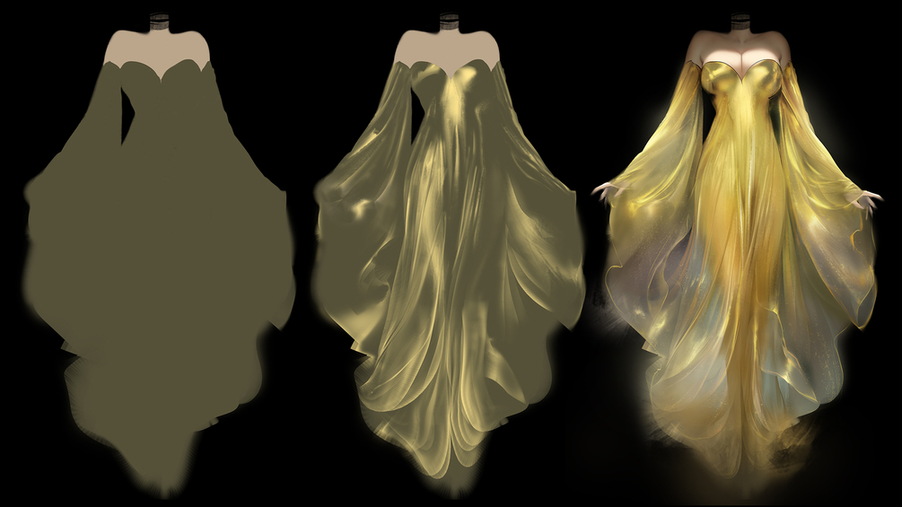 這次要示範的是一件充滿夢幻氣息的金色薄紗禮服!這次我以黑色為底,去突顯金色的質感。其飄逸的裙襬搭配透明感布料,我想營造輕盈又高貴的視覺效果。影片中將展示薄紗質感的畫法、折線與透膚感的處理技巧。無論你喜歡華麗風、幻想風,還是想挑戰不同布料的表現手法,這篇教學都絕對不能錯過喔~^^