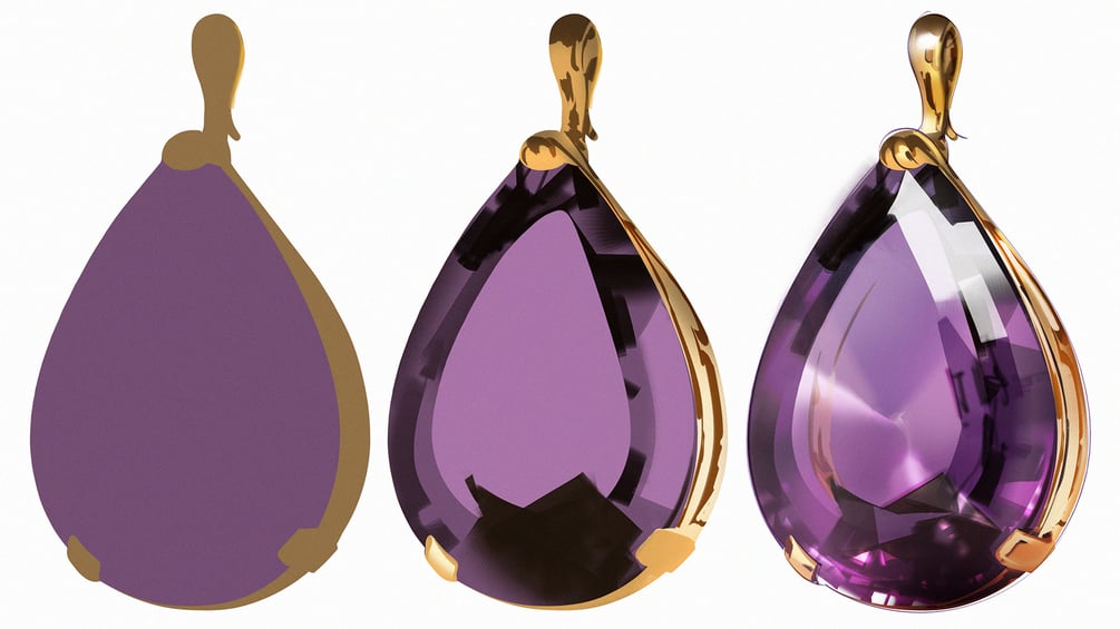 투명한 보석은 많은 사람들에게 가장 어려운 소재 중 하나입니다. 굴절, 투광성, 두께감을 표현해야 할 뿐 아니라, 여러 면이 겹치면서 생기는 복잡한 반사까지 다뤄야 하기 때문입니다. 특히 자수정처럼 색감이 깊고 층이 많은 보석은 난이도가 더욱 높습니다.