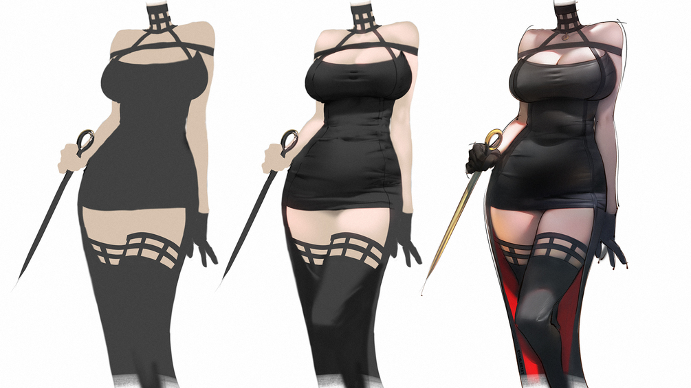 這次帶來的是《間諜家家酒》約兒服裝的材質繪製示範!約兒這套經典黑色連身裙最大的特點,就是帶有微微光澤的絲緞質感。我在繪製時特別著重於服裝的高光表現,以及緊貼身體的布料所產生的皺褶細節,並透過光影的細緻變化,營造出布料光滑又柔軟的觸感。這種光滑且帶些反光的材質,適合運用在強調角色曲線的服飾上,大家在練習時可以嘗試看看!希望本次的示範對你們有所幫助喔~!