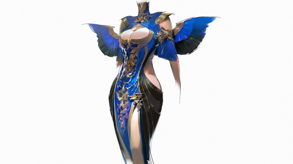 "Azure Reverie" 의 디자인은 파랑새에서 주요 영감을 받아, 그 우아하고 가벼운 날개 형태를 디자인에 녹여냈습니다. 짙은 파란색을 메인 컬러로 사용하여 꿈같은 자유와 신비로움을 상징했습니다. 의상의 실루엣은 부드럽고 흐르는 곡선미를 강조하며, 어깨 양쪽의 각진 디자인은 복형(Geomatrix) 구조에서 영감을 받았습니다. 거꾸로 된 삼각형 요소는 가벼운 시각 효과를 강조합니다. 또한, 금색 디테일 장식을 사용하여 고귀함과 장엄함을 더해 섬세함 속에서도 강인함을 표현했습니다. 이 의상은 파란색이 주도하는 환상적인 분위기를 연출하는 것을 목표로 하고 있습니다.